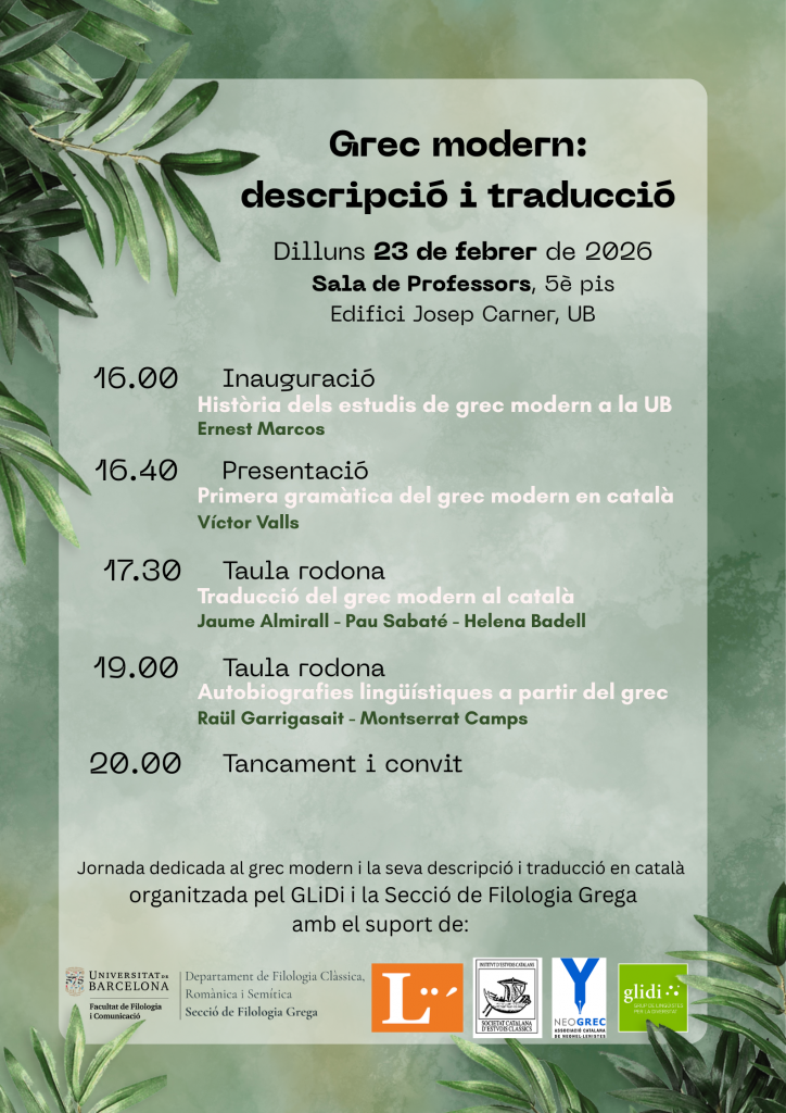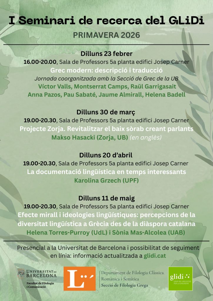 La primavera de l’any 2026 estrenem el Primer Seminari de Recerca del Grup de Lingüistes per la Diversitat, amb el suport de la Secció de Lingüística del Departament de Filologia Catalana i Lingüística General, i de la Secció de Filologia Grega del Departament de Filologia Clàssica, Romànica i Semítica de la Facultat de Filologia i Comunicació de la Universitat de Barcelona.